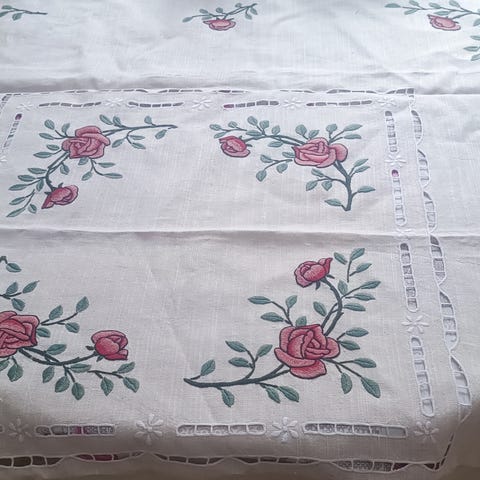 Tässä on todella kaunis, 1970-luvun tunnelmaa huokuva pellavapöytäliina, joka on säilynyt yllättävän erinomaisessa kunnossa.