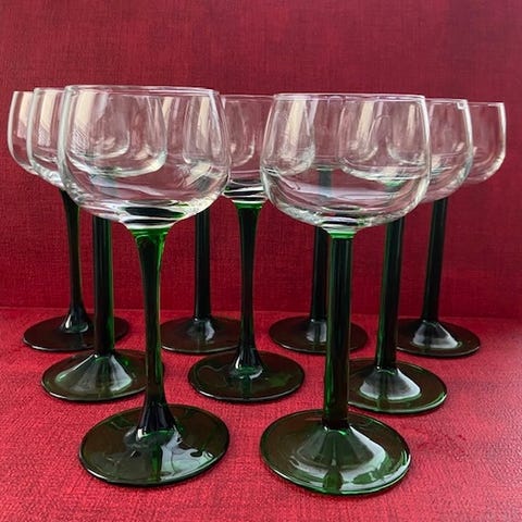 Luminarc viinilasit vihreällä jalalla, materiaali lasi. Lasien maljaosa on kirkas ja jalka sekä pohja vihreät. Soveltuvat esimerkiksi viini- tai jälkiruokajuomille. Myydään neljän lasin settinä kuvien mukaisesti.