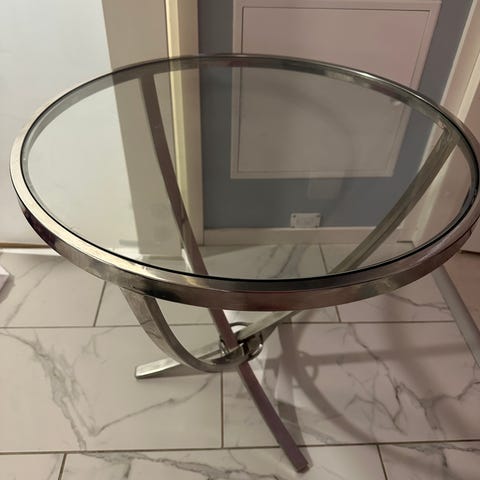 Pyöreä sohvapöytä, jossa irrallinen lasipäällys.