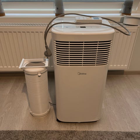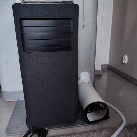 Siirrettävä ilmastointilaite sisätilojen viilennykseen. Laitteessa on etupaneelissa ilman ulostulo ja takana ilmanotto- sekä poistoaukot. Yläosassa on ohjauspaneeli, jossa on digitaalinen näyttö ja painikkeet eri puhallinnopeuksille, toimintatiloille (esim. cool, dry, fan) sekä ajastimelle. Laitteessa on pyörät helpottamassa siirtämistä huoneesta toiseen. On kaukosäädin. Väri on valkoinen.
