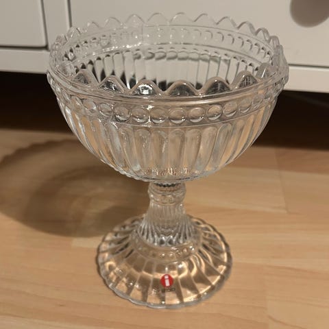 Iittala pieni hiekan värinen mariskooli. Sopii esimerkiksi jälkiruokien, karkkien tai pienten tarjoiltavien esillepanoon. Valmistettu lasista, jossa Iittalan tunnusmerkki-etiketti jalassa. Uudenveroinen. Viimeisessä kuvassa näkyy koko verrattuna normaalikokoiseen Mariskooliin.