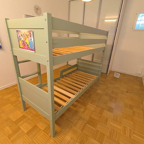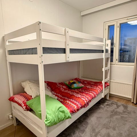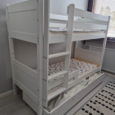 Muurame kerrossänky lastenhuoneeseen. Kerrossängyssä on kaksi päällekkäistä nukkumapaikkaa ja sivuilla suojalaidat ylemmässä sängyssä. Rungossa yhdistyvät valkoiset levyosat ja puunväriset päädyt sekä tikkaat. Soveltuu kahdelle lapselle tai vierassängyksi lastenhuoneeseen. Sopii myös aikuisille