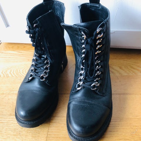 Mustat toppavartiset saappaat koko 37, pohjan sisäpituus n. 24,5 cm. Kantapää ja kärki vedenpitävä.