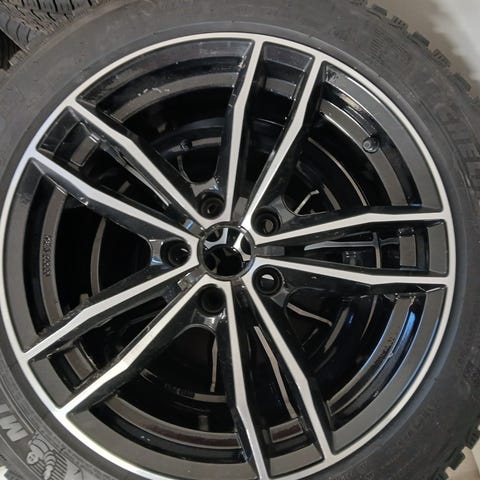 BMW alumiinivanne renkaalla. Vanteessa on monipuolinen monipuolinen puola‑/palkkimuotoilu ja keskellä BMW:n merkki. Rengas on asennettuna vanteelle. Sopii BMW‑henkilöautoon, tarkempi koko ja pulttijako kannattaa varmistaa omasta autosta tai vanteen merkinnöistä.