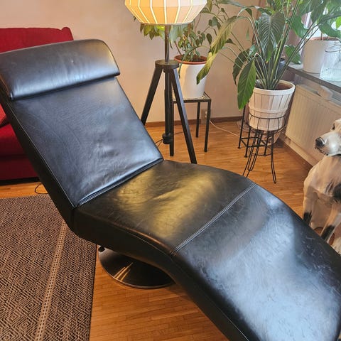 Musta, nahkainen lepotuoli / divaani säädettävällä olkanojalla
