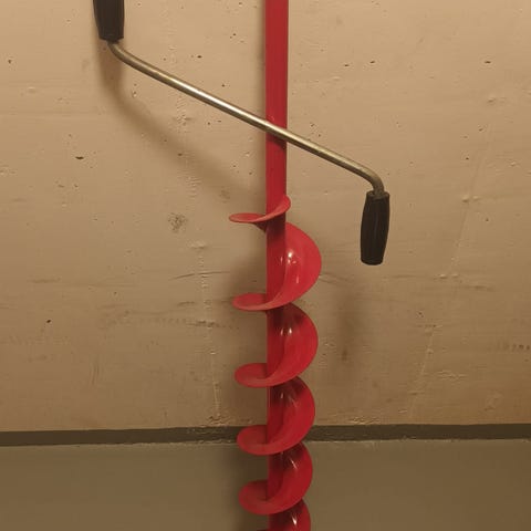 Taitettava metallivartinen jääsaha jossa sinkitty varsi ja otetta parantavat neopreenipehmusteet.