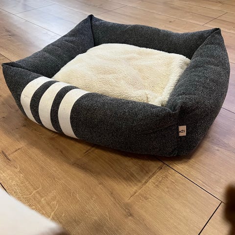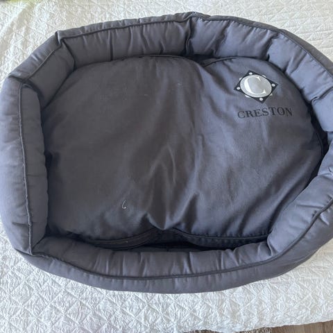 Koiranpeti pehmustettu harmaa ja beige. Kuvissa hinnat