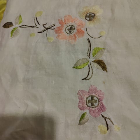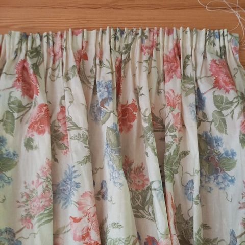Puuvilla, ryhdikkäät. Verhot leveys leveys 139x korkeus 165. Kappa 44x103. Kappa/liina 103x65 ja liina 35x113