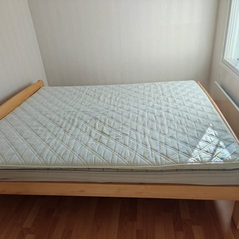 Leveys 167 cm mitattuna sängyn jalasta toiseen, mahtuu siis 160 leveä patja.