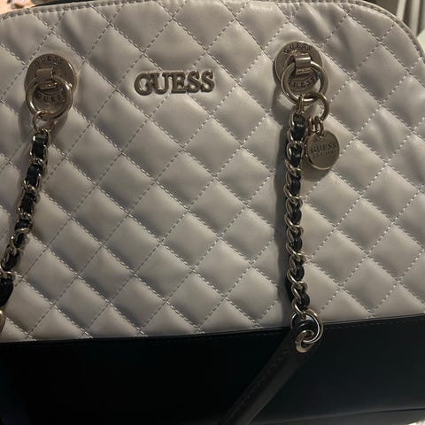 Guess käsilaukku naisille. Materiaalina tekonahka. Laukussa on kantokahvat sekä olkahihna. Pääosasto suljetaan vetoketjulla, sisällä useita lokeroita ja taskuja pientavaroille. Ulkopuolella on vetoketjutasku. Vuori on kuviollinen kangas. Sopii arkilaukuksi tai siistimpään käyttöön.