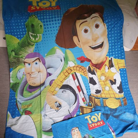 Toys story lasten pussilakanasetti, jossa Toy Story -aiheinen kuosi. Toisella puolella on suuri kuviointi Woody- ja Buzz Lightyear -hahmoilla, toisella puolella oranssiin ja keltaiseen sävyihin painettuja Toy Story -hahmojen siluetteja. Sopii lasten sänkyyn.