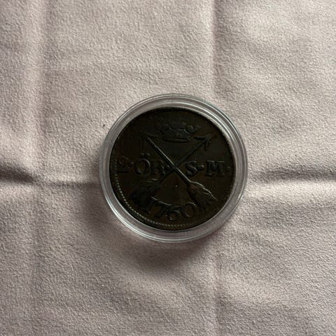 Ruotsin 2 äyriä kolikko Fredrik I:n ajalta 1748