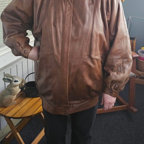 Ruskea antiikkinahkainen vintage Pop's-merkkinen naisten nahkatakki, jossa on olkatoppaukset. Takin koko on L, mutta se on hyvin reilun kokoinen.