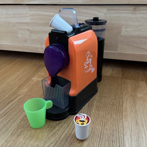 Myydään hyväkuntoinen lasten puinen kahvinkeitin / espressokeitin. Mukaan tulee kaksi muovista mukia, kolme "makunappia" ja sokerirasia. Toisella sivulla oleva keltainen nuppi liikkuu.