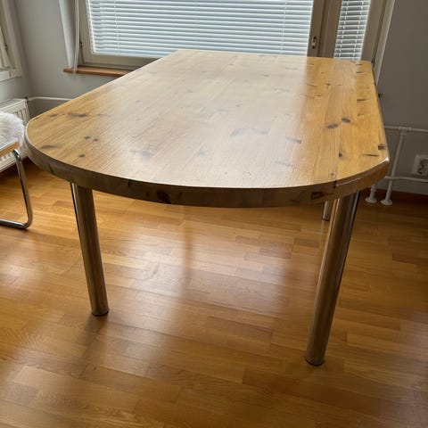 Komea, jykevä täyspuinen pöytä kauniilla yksityiskohdilla. Käsitelty puuvahalla valkoiseksi vuosia sitten. Käytön jälkiä lasilevyn ja pöydän pinnoissa, kunto muutoin moitteeton. Kuljetus mahdollinen lähialueelle.