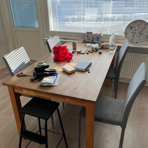 Annan sinulle mukavan ison ruokapöydän ja kolme tuolia
