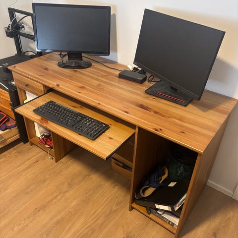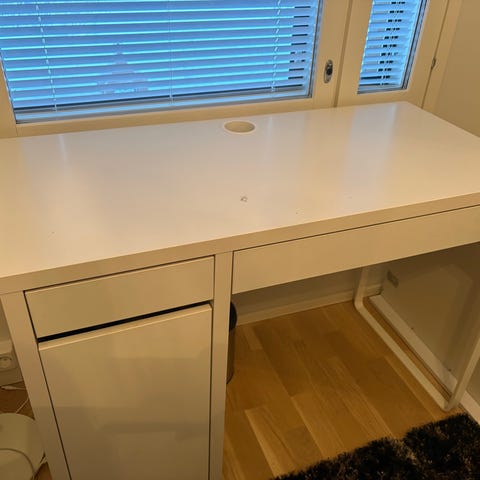 Hyväkuntoinen työpöytä, kannessa yksi pieni runttu, mikä kuvattuna.
