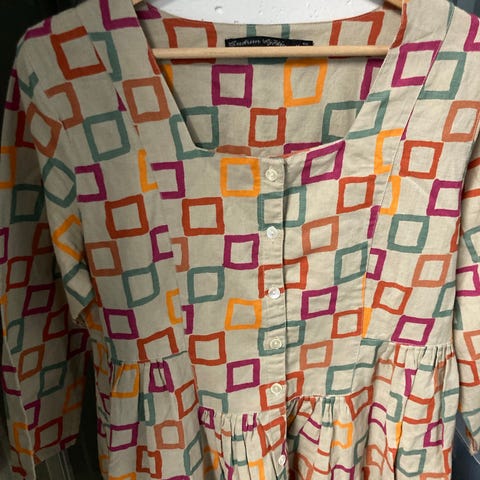 Gudrun Sjödenin mekko, materiaali 100% pellava. Napitus alas asti, ei keskeltä vaan hiukan sivulta. Edessä taskut. Osaan kankaasta on painetun kuvion päälle ommeltu kirjailua. Koko on reilu M, mitat: kainalosta kainaloon 54 cm, olalta helmaan edestä mitattuna 97 cm, helma takaa kaareva ja pidempi ja hiha kainalosta hihansuuhun 31 cm.