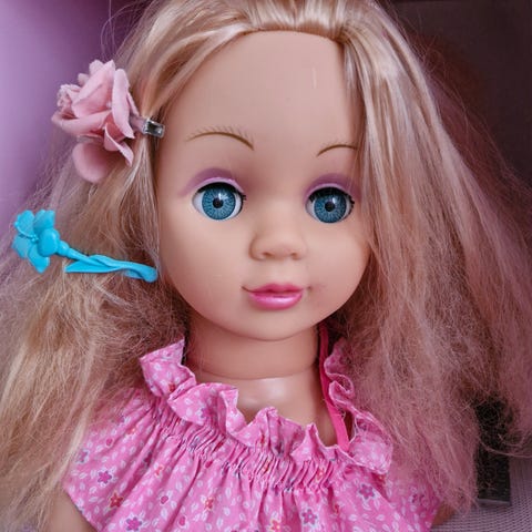Hyväkuntoinen kampauspää, mukaan kuvassa näkyvät tarvikkeet.