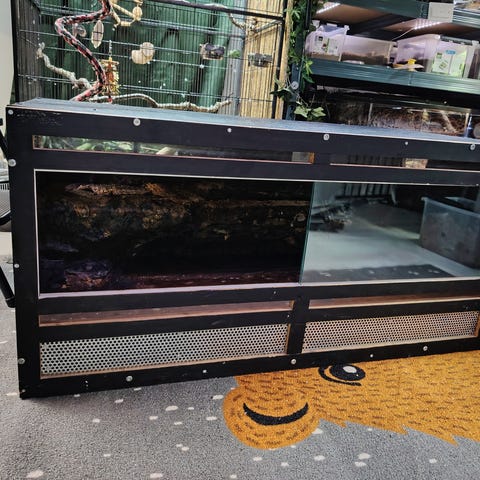 Myydään hyvä kuntoinen iso terraario. Ollut parta-agamalla käytössä. Pohjassa halkeama joka näkyy kuvissa, ei ole haitannut käyttöä. Mukaan halutessa vanha lämpö lamppu, uv Led-putki sekä terraarion alla oleva taso. Terraarion koko L160cm/K55cm/S64cm