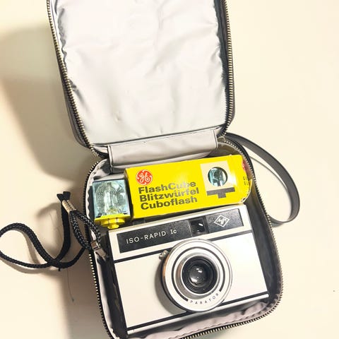 Agfa taittokamera nahkaisella laukulla