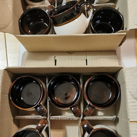 Kermansavi Oy kahvikupit/ cappuccinokupit ja asetit ruskea-valkoinen keramiikka. 6kpl. Yhden vetoisuus 1,5dl. Sopivat kahvin, teen tai muiden kuumien juomien tarjoiluun arkeen ja kattauksiin. Materiaalina lasitettu keramiikka. Nouto tai postitus.