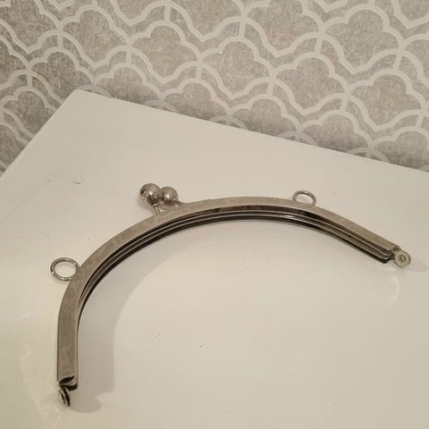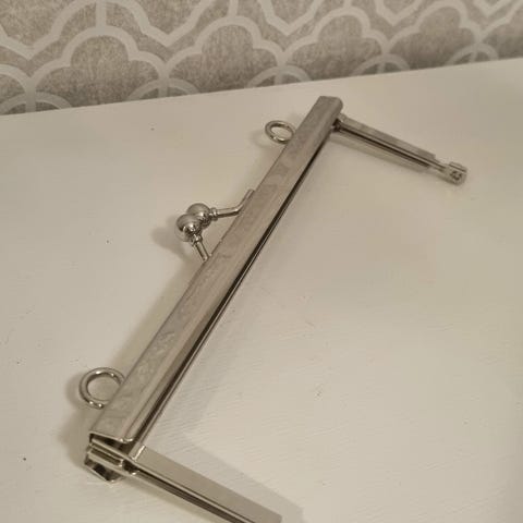 Metallinen laukunkehys, jossa metalliset ripustuslenkit olkahihnaa varten. Käsitöihin, tee itse laukku! Leveys 25.3 cm.