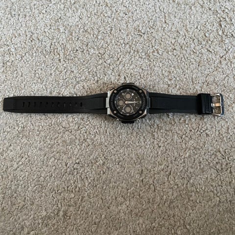 Casio G-Shock GA-2100 -rannekello. Kellossa on musta runko ja ranneke sekä musta kellotaulu, jossa on sinisiä yksityiskohtia. Kellossa on analoginen ja digitaalinen näyttö. Taustassa on merkintä Carbon Core Guard -rakenteesta. Sopii jokapäiväiseen käyttöön tai vaikka inttikelloksi. Hintaan sisältyy metallinen säilytysrasia.