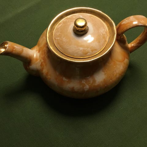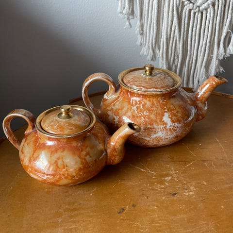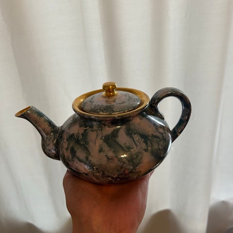 Vaalen siniset teekannu, sokerikko ja kermakko.