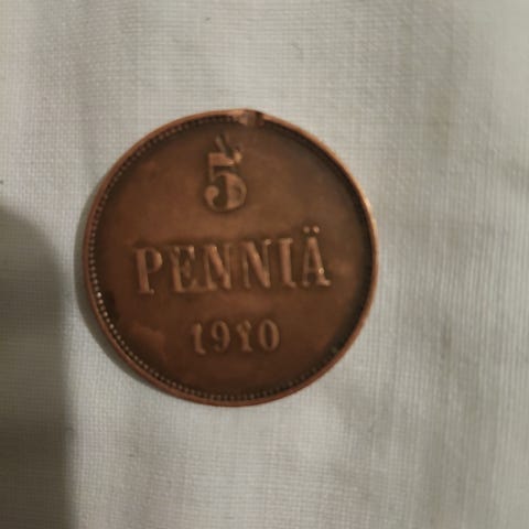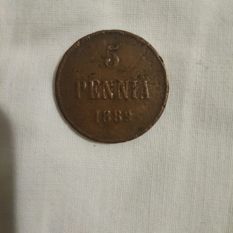 Tämä esine on suomalainen kuparinen 5 penniä -kolikko vuodelta 1865, joka on peräisin Suomen suuriruhtinaskunnan ajalta,. Materiaali: Kupari.