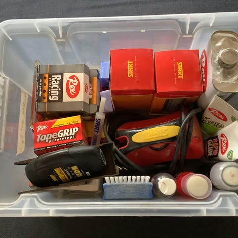 Nylon/messinkiharja, siklauslastoja, pitovoidekorkit ja olas sikli. Kaikki yhteensä.