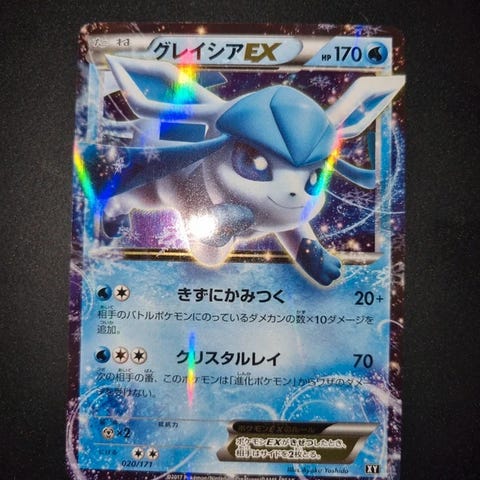 Pokémon Glaceon EX -keräilykortti. Kortissa on Glaceon-hahmo ja hyökkäykset Chilly Breath sekä Avalanche. Soveltuu Pokémon-korttipeliin ja keräilyyn.