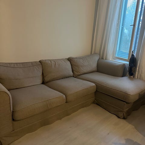 Sohva 330*195, syvyys 90. Istuinkorkeus 44 cm, selkänoja takaa 80 cm. Irrotettavat ja pestävät päälliset. Kantoapua saa, runko purettavissa pienempiin osiin. Tukeva. Hae pois muuton tieltä :)