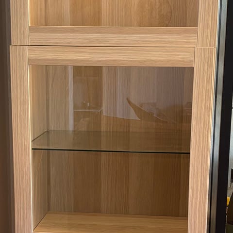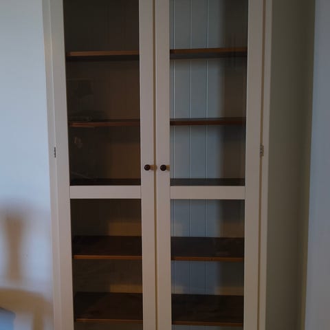 Valkoinen Vitriini valoilla ja lasihyllyllä