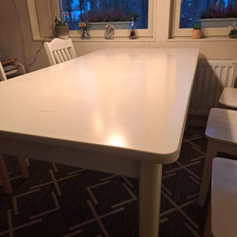 Pitkään käytössä ollut 120cm ruokapöytä. Lasinen pinta metallisilla jaloilla. Käytön jälkiä löytyy ja yhden jalan ruuvi ei tahdo kiristyä tiukalle, joten on kiikkerä. Ei olla koitettu korjata asiaa. 😁 Haku mahdollisimman pian Nivavaarasta.