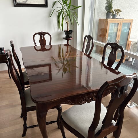 Myydään ovaalin muotoinen Kustavilainen jatkettava ruokailuryhmä. Myydään mielellään settinä. Tuoleissa on käytön jälkiä, mutta on todella helppo päällystää uudelleen. Setin ovh yli 4000€