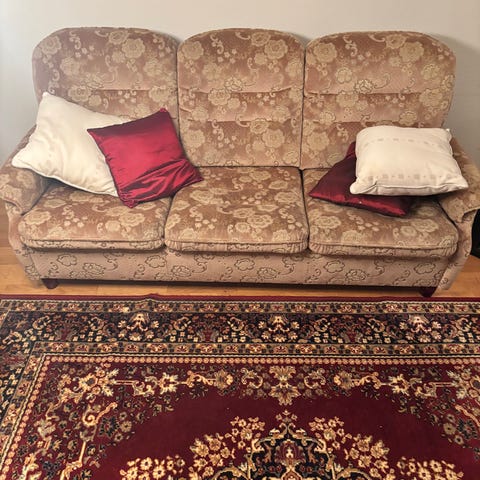 Konjakinväriset Veken sohva ja nojatuoli settinä. Noin neljä vuotta vanhat ja olleet kakkoskodissa vähemmällä käytöllä.