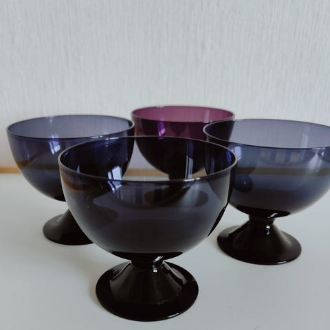 Todella kauniit turkoosin siniset Saara Hopean suunnittelemat jalalliset jälkiruokamaljat. Täysin ehjät ja virheettömät. Sinisen maljan halkaisija 11 cm ja korkeus värittömän jalan kanssa 8,5 cm.