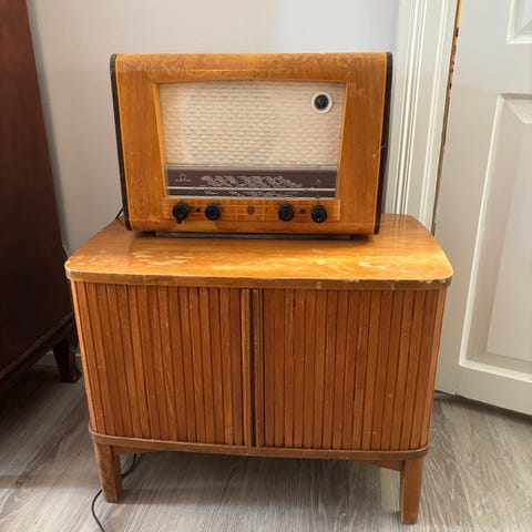 painava kaappi. Radio toimii, levysoitin ei. Virtajohto uusittu. Kannessa tummentuma ja laikku. Muuten hyväkuntoinen, mukaan 3kpl levyjä. Vain nouto, maksu käteinen tai mobilepay