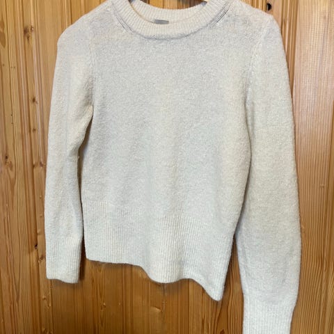 Lindex naisten neulepusero koossa XS. Väri on valkoinen ja materiaali akryyliä. Neuleessa on läpikuultava, reikäneulottu pinta ja pitkät hihat. Malli on suora ja pituudeltaan lantiolle tai hieman sen alapuolelle ulottuva.