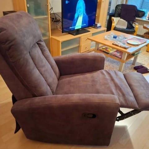Pohjanmaan kalusteen valmistama laadukas, pyörivä ja keinuva Verona meganismituoli HR5. Sisäpuolella olevasta vivusta saa jalkatilan esille. Kangasverhoilu laadukas Naomi 324, väri beigeen vivahtava vaalea roosa. Tuoli ostettu Stockmannin Iskusta helmikuun alussa 2026. Ovh. hinta 1941€, tarjoushinta ollut 1456€.