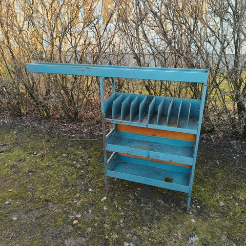 Pakettiautossa olleet kalusteet. Hylly jonkun itse tekemä, mutta ajaa asiansa.