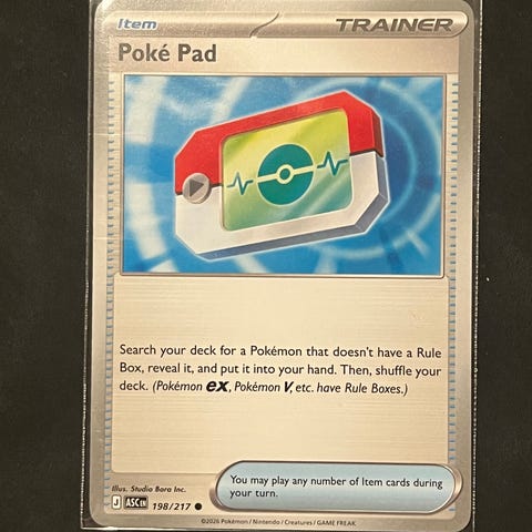 Pokémon Poké Pad trainer-kortti. Kortti on esine-tyyppinen (Item) valmentajakortti, jonka vaikutuksena on etsiä pakasta Pokémon, jolla ei ole Rule Boxia, paljastaa se ja ottaa käteen, minkä jälkeen pakka sekoitetaan. Sopii käytettäväksi Pokémon-korttipelissä osana pelipakkaa tai kokoelmaa.