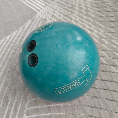 Keilapallo yhdelle kädelle porattuna. 14 lb paino.