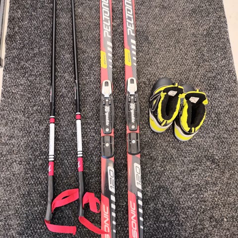 Myydään Lasten, jo pieneksi jääneet sukset sauvoineen n. 120cm,monot koko 34.