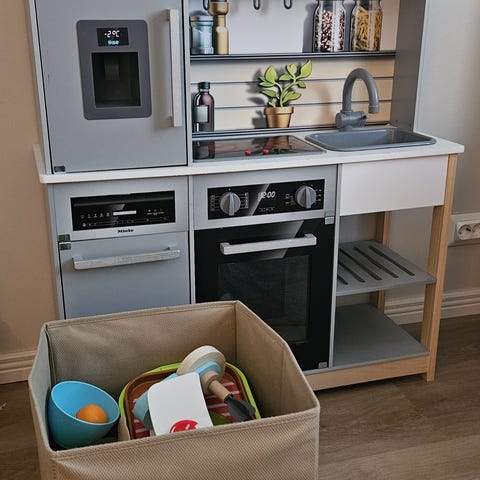 Hyvä- ja siistikuntoinen Ikean leikkikeittiö kuvissa näkyvine astioineen. Muutama pieni tussin jälki, jotka näkyvät kuvissa. Korkeus: 104cm, leveys 72cm, syvyys 39cm.