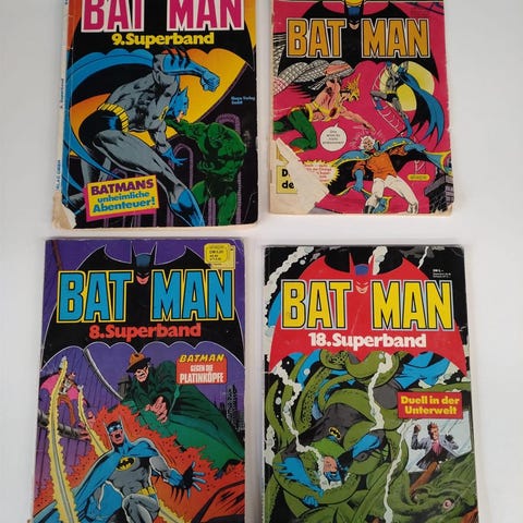 Kokoelma Batman-sarjakuvalehtiä, jotka sisältävät useita seikkailuja. Lehdet ovat saksankielisiä ja niissä on värikkäitä kansikuvia.