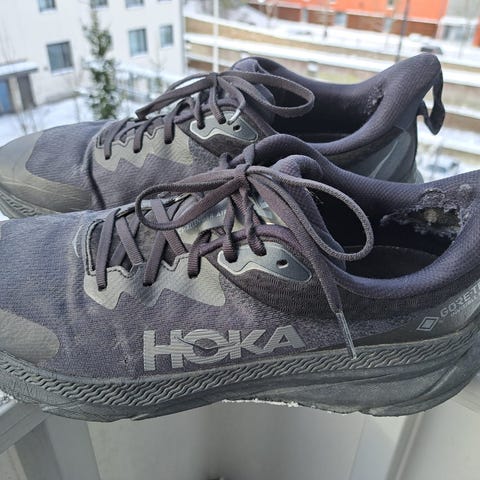 Vedenpitävät ja kevyet maastojuoksukengät, joiden Gore-Tex-kalvo pitää jalat kuivina ja miellyttävän tuntuisina. Hyvä vaimennus ja hyvä pito alustalla. Pienehkö koko. Droppi: 5 mm.HOKA Challenger 7 Gore-Tex on valmistettu hengittävästä kaksikerroksisesta verkkomateriaalista, jossa on kärjen ympärillä ylimääräinen pehmuste. Ilmava ja hyvin suojaava juoksukenkä.Välipohjan CMEVA-vaahto tarjoaa pehmeän ja vakaan tuntuman liikunnan aikana. Uusi kantakappitekniikka, jossa anatominen akillesmuotoilu.Ulkopohjan alla on strategiset 4 mm nystyt, jotka varmistavat hyvän pidon alustalla.Juoksukengässä on kierrätetty Gore-Tex-kalvo, joka pitää jalat kuivina ja mukavina juoksun aikana. Invisible Fit -tekniikka on kalvo, joka on ommeltu suoraan päälliseen, mikä tekee kengästä kevyen ja tarjoaa vieläkin paremman istuvuuden.