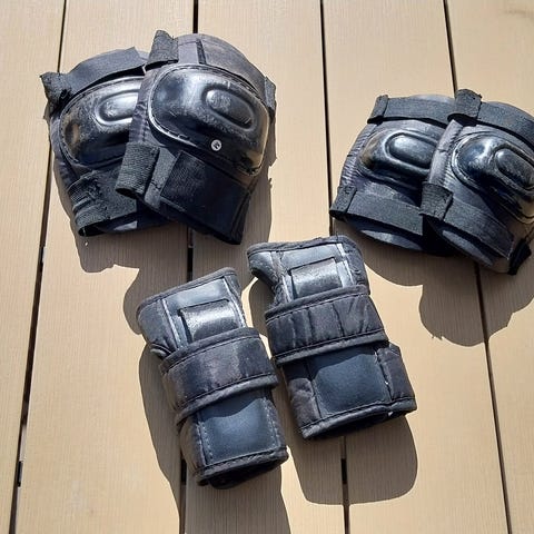 Myydään rullaluistelusuojasetti sisältäen polvi- ja kyynärsuojat.