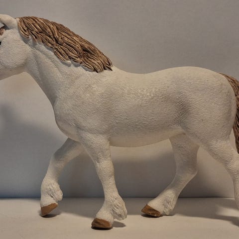 Kuvienmukainen valkoinen tamma, 2017. Pientä maalipinnan kulumaa/leikin jälkeä. Pysyy pystyssä, mutta jalat eivät asetu ihan oikein, joten huojuu. Jalkoja mahdollisesti saisi taivutettua, mutta en ole lähtenyt yrittämään.